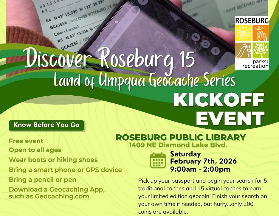 Hosted by Roseburg Parks and Recreation, the Discover Roseburg 15 Land of Umpqua Geocache Series kick-off is a free, family-friendly event designed to draw people of all ages outside to experience more of the city and its businesses. The kick-off will be held from 9 a.m. to 2 p.m. at Roseburg Public Library, where Parks staff will give out verbal instructions and coordinate-containing “passports” for a geocaching treasure hunt.