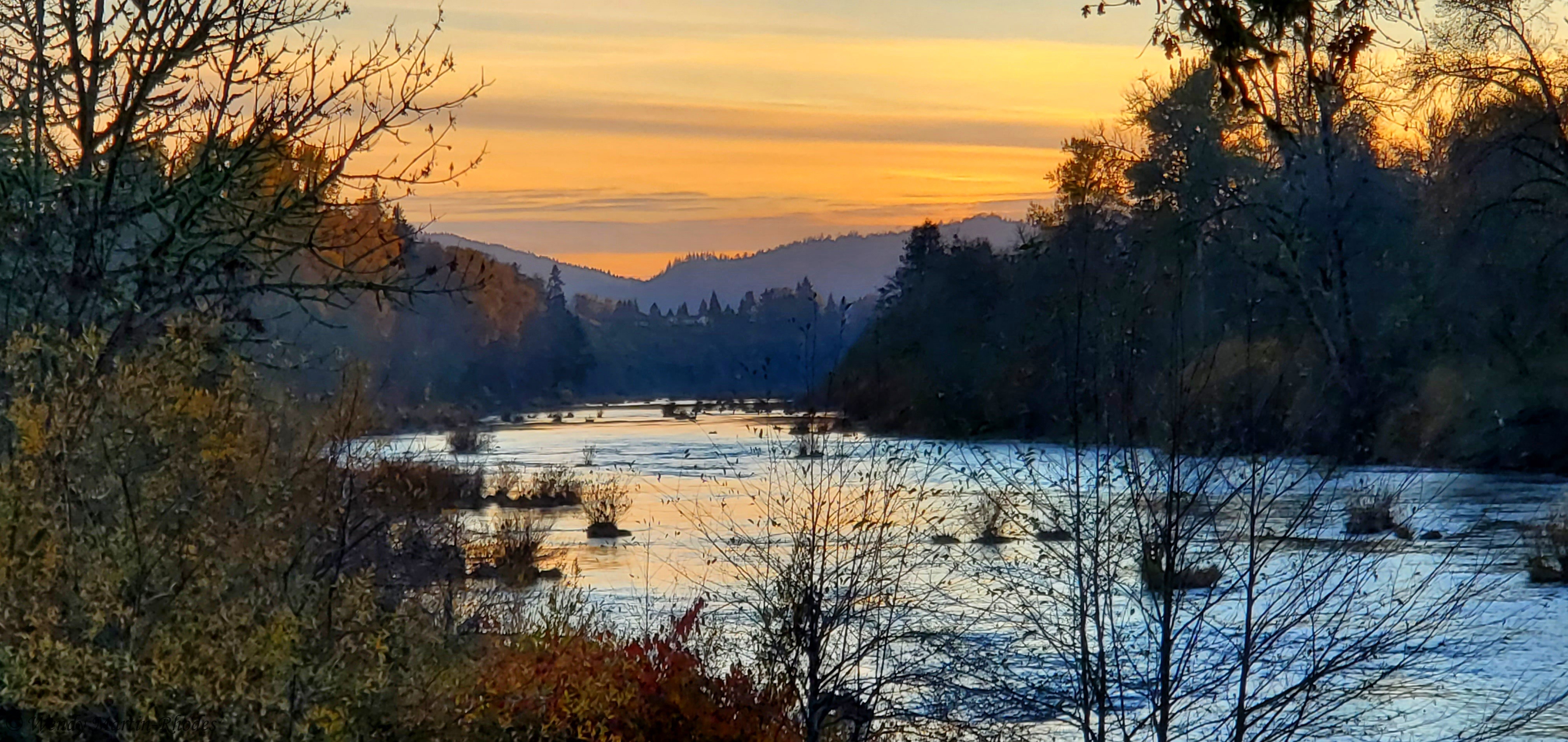 North Umpqua River just upstream from Hestnes Landing: "View of North Umpqua River looking downstream at sunset"