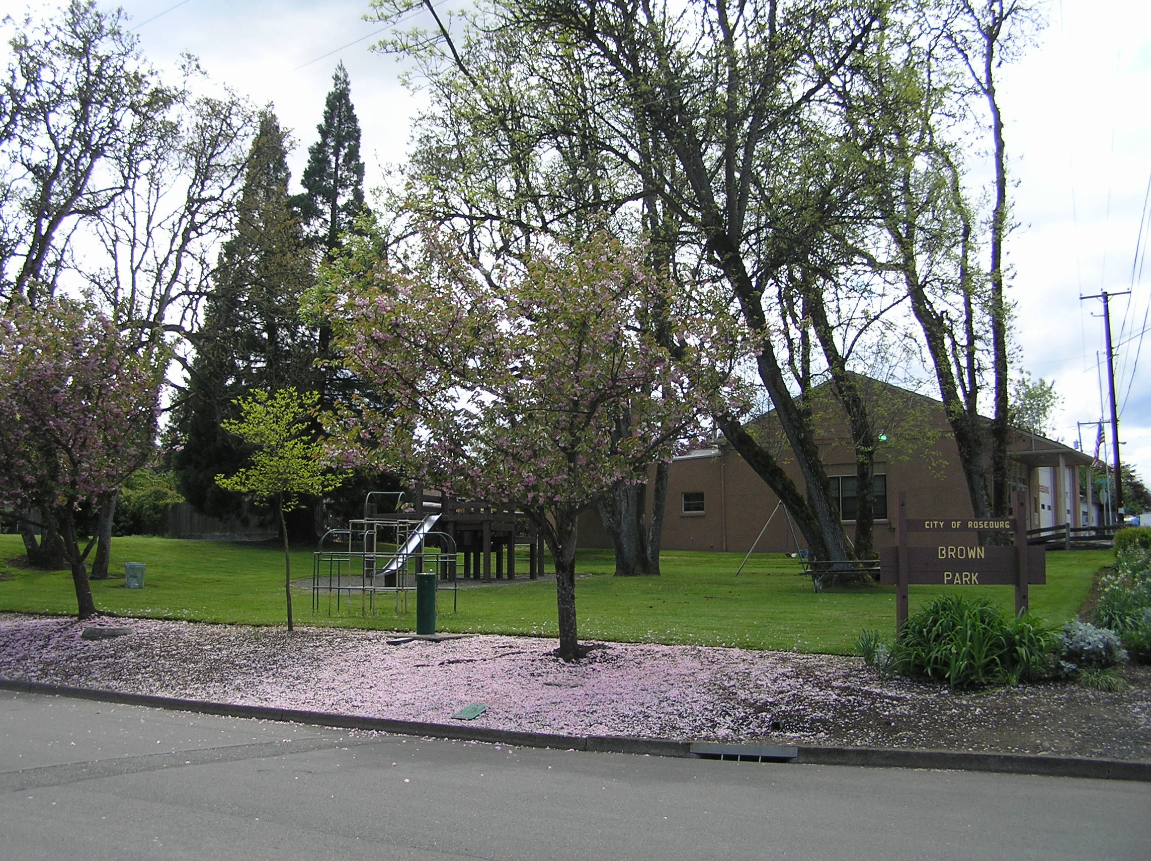 Brown Park is a small park located next to the Harvard Ave. Fire Station in West Roseburg. The park contains playground equipment, picnic table, and drinking fountain.