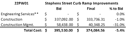 Design work is underway for the design/redesign of ADA curb ramps improvements on SE Stephens Street from the edge of the southern City limits to SE Brockway Avenue. Design work includes replacing approximately 18 curb ramps on 15 street corners, and pavement rehabilitation for approximately 2,100 LF of roadway on SE Stephens Street.