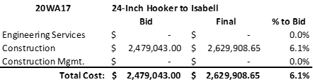 Consultant has finalized design and bid documents. Project will bid when funding has been approved in the budget. This project will upsize approximately 3,200 LF of existing 8-inch asbestos cement water main with 18-inch ductile iron water main. Project is designed.