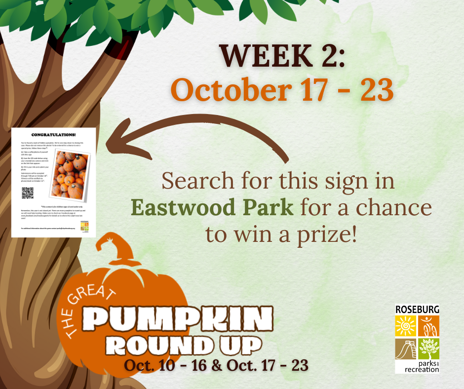 Local pumpkin patches have been emptied by a pumpkin thief and the missing gourds have been hidden in one of Roseburg’s parks. We have marked the last know location of the culprit with a paper photo of the stolen pumpkins. We need the kids of Roseburg and the surrounding area to help us track down the missing pumpkins so we can round them up in time for the harvest! Children 12 and under are encouraged to take a selfie with the paper photo when they find it for a chance to win a prize. (Do not remove the paper).