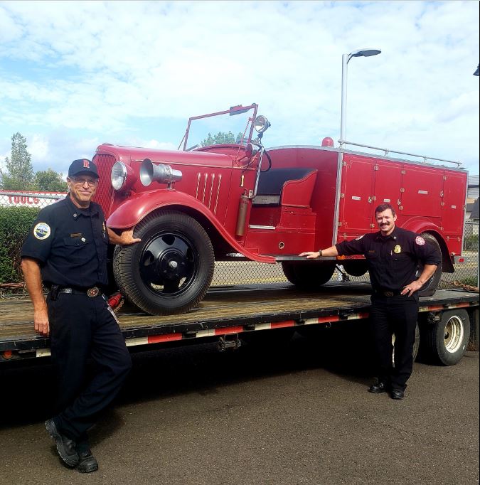 Yesterday (Tuesday, Sept. 26) was a monumental day for the City of Roseburg Fire Department. On behalf of Fire Chief Christopherson and City Manager Messenger, Battalion Chiefs Drew Fairbairn and Chris Galligan took possession of, transported, and brought back a piece of department history to the excitement of department personnel.