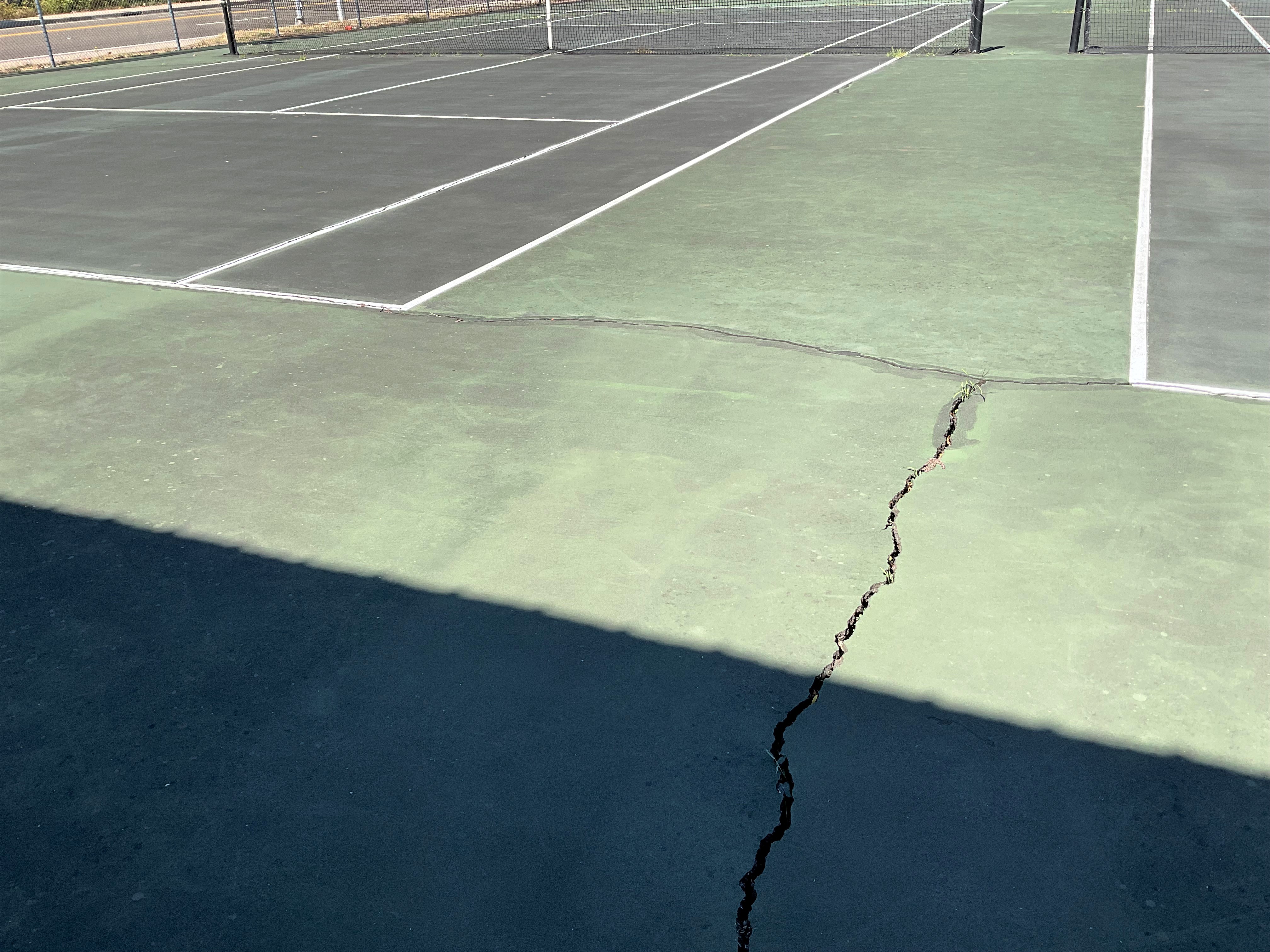 The courts sometimes hold puddles of standing water after rainfall due to uneven surfaces. Over the years, the outdoor tennis courts have been resurfaced more than once and cracks up to three inches deep have been sealed repeatedly.