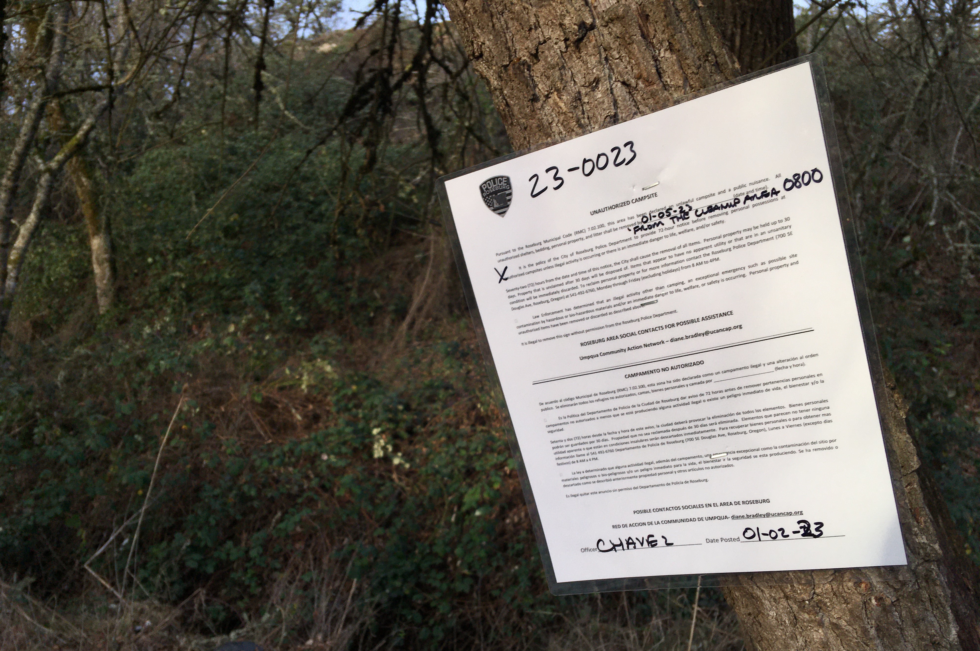 Roseburg Police have not issued prohibited camping citations since at least early 2020. Roseburg Officers currently give tickets for other unlawful behavior connected to camping on public property such as offensive littering, depositing trash in waterways or within 100 yards of a waterway, vandalism (aka criminal mischief), drinking in public, having an unleashed dog and other violations.
