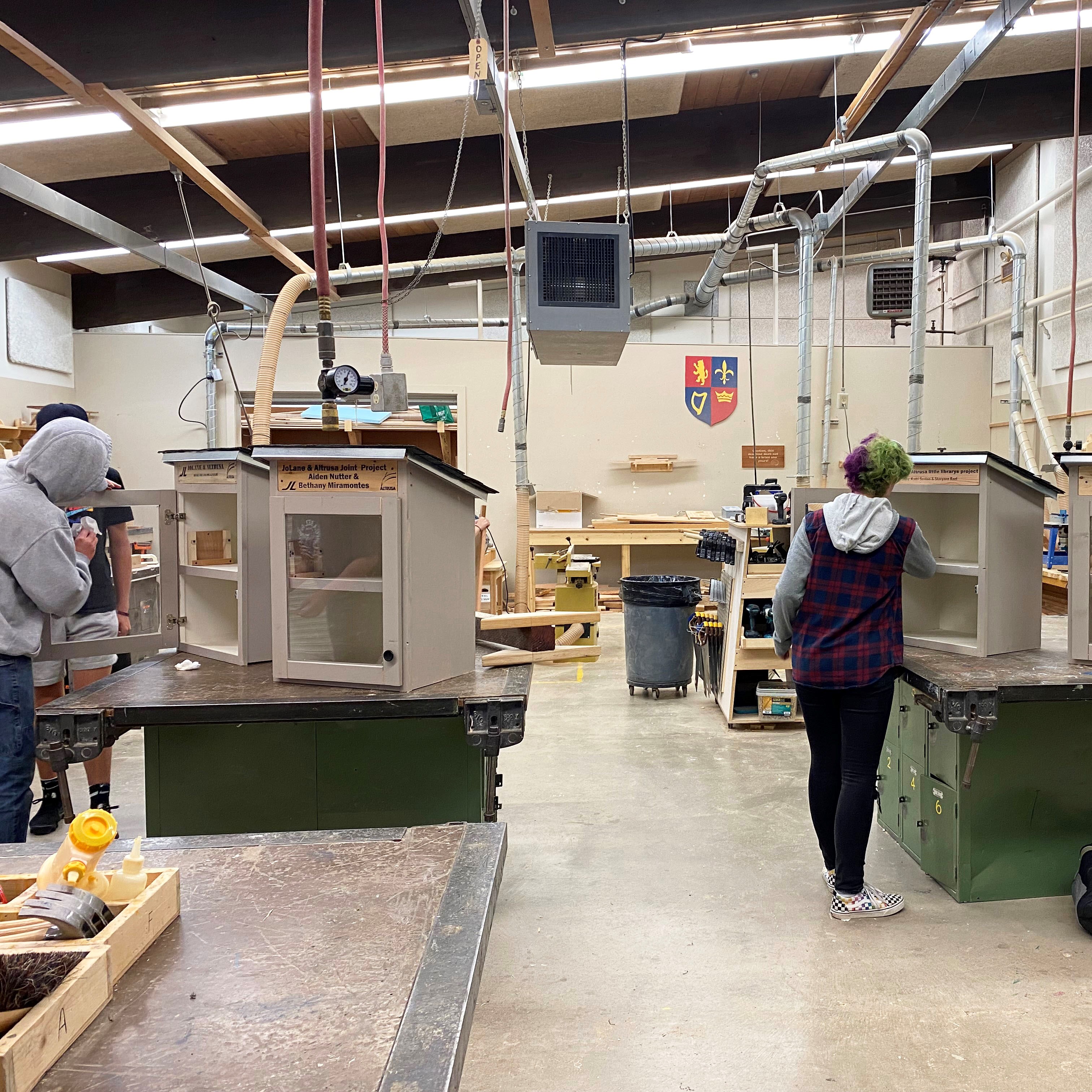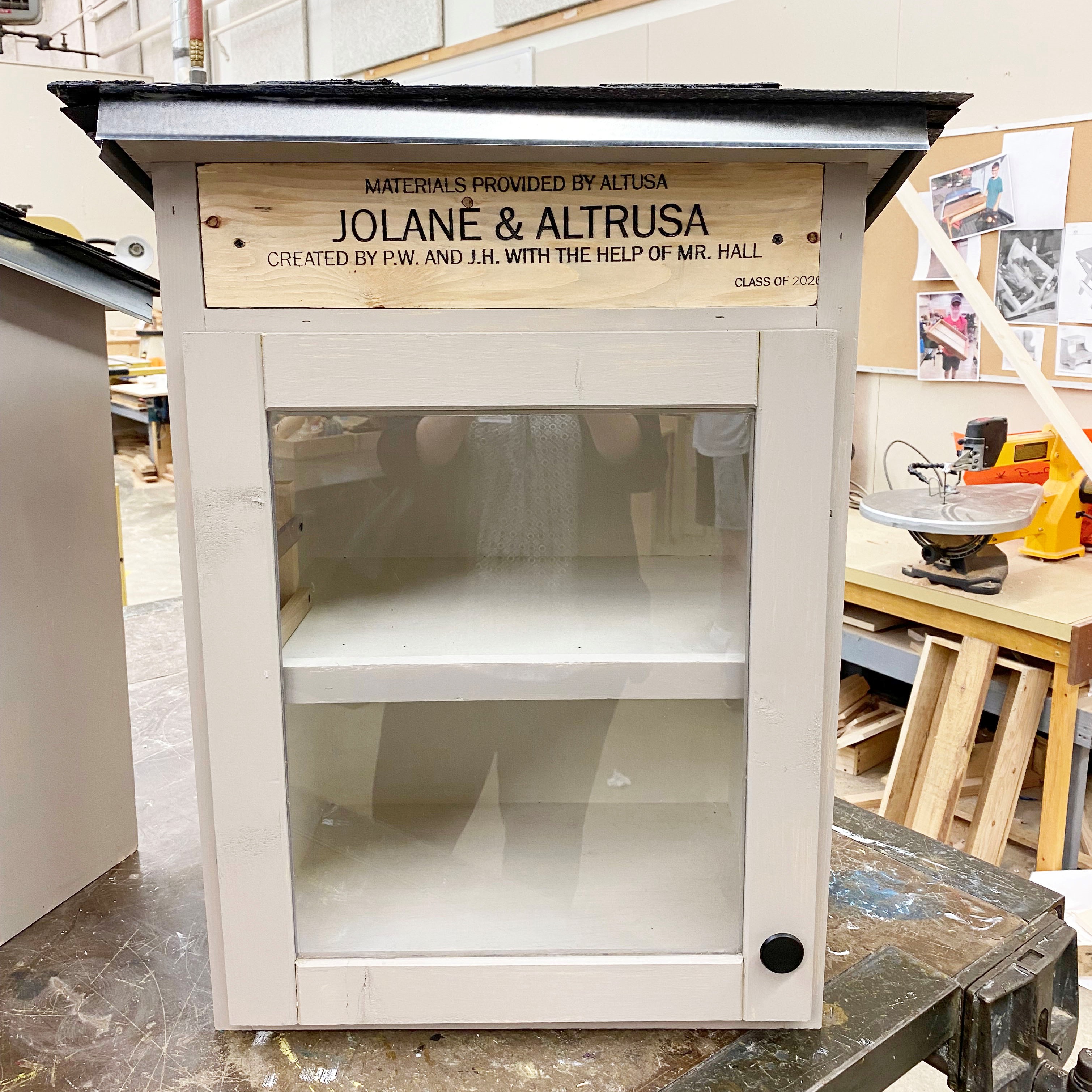 Organized by Altrusa International of Roseburg, the book-sharing boxes were built by 10 Joseph Lane Middle School eighth graders taking an advanced wood shop class with teacher Matt Hall. The students built five community library cabinets. Each structure bears a handmade sign that identifies the student builders.