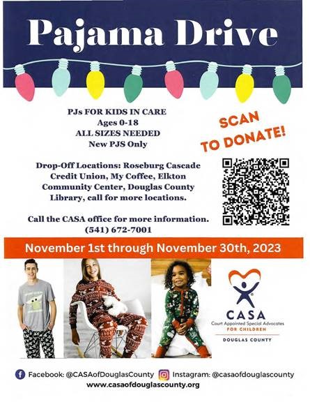 CASA’s Pajama Drive has been held for a little more than a decade to provide new pajamas to children in foster care. Boxes for CASA’s pajama drive are now set up at Roseburg City Hall’s Administration Department and the Roseburg Public Safety Center. City employees and residents can donate to the pajama drive by dropping off pajamas for children of all sizes from infant to teens XXL by 5 p.m. Thursday, November 30. Pajamas should be new, with store tags still on, and unwrapped.