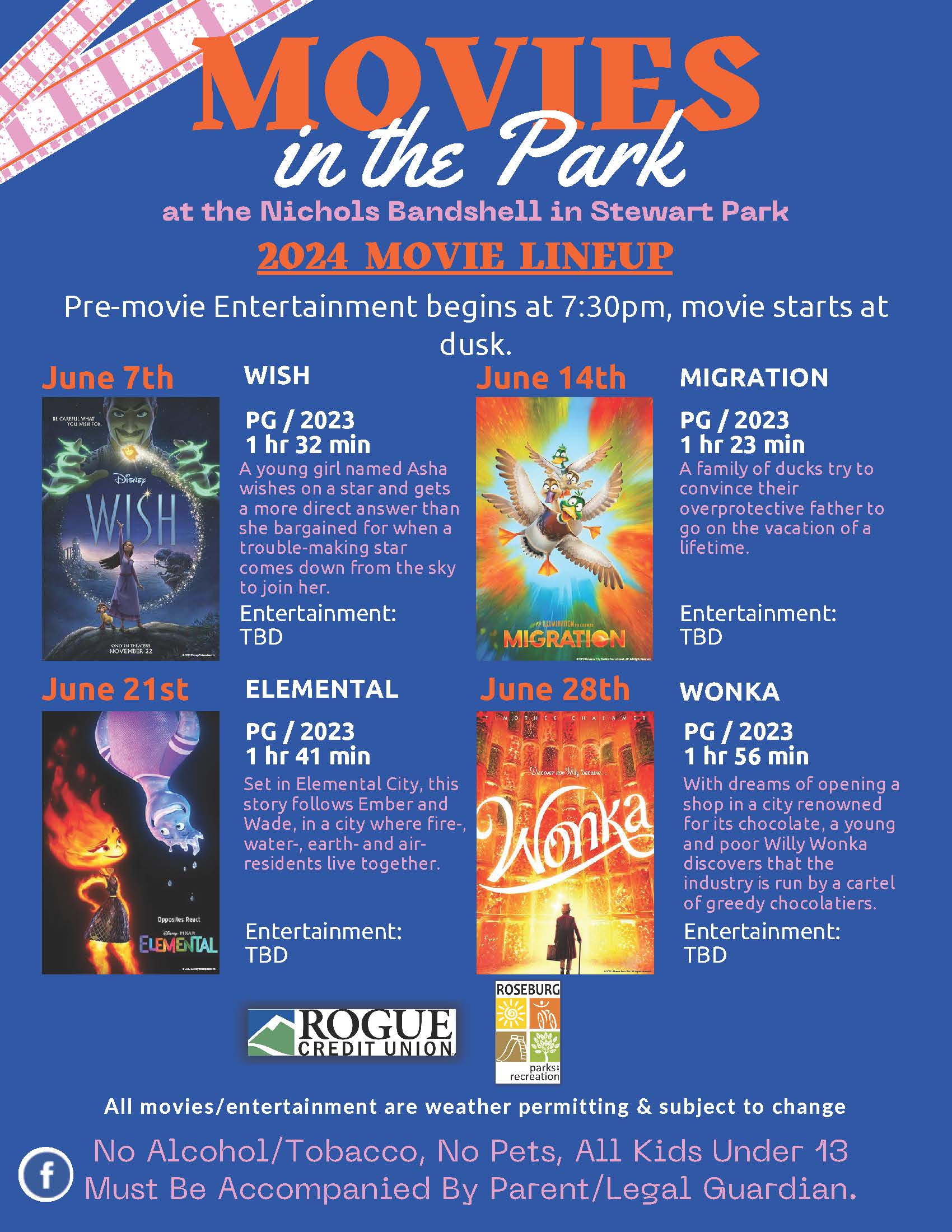 For more information and details about the pre-movie entertainment call 541-492-6730 or visit the Roseburg Parks and Recreation Facebook page or www.cityofroseburg.org/parks-and-recreation.