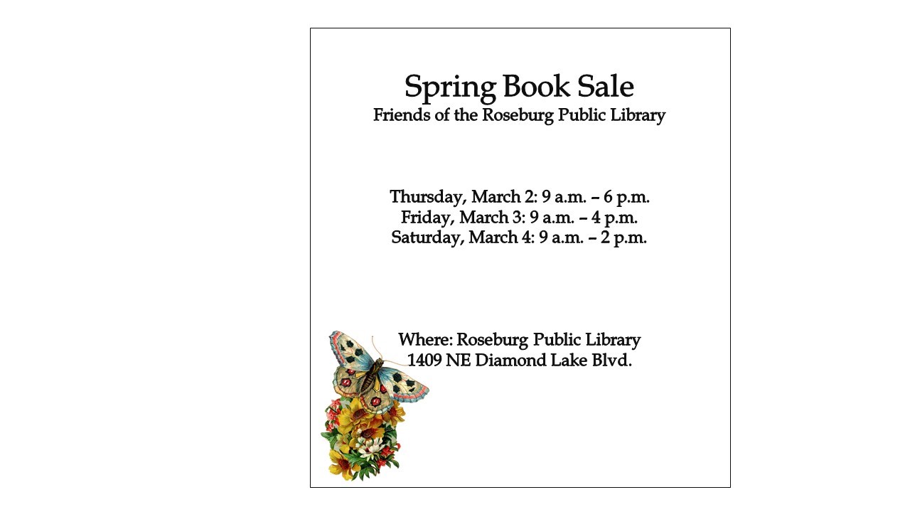 ROSEBURG, Ore. – Love books? Then prepare to fall in love with another great find at the Friends of the Roseburg Public Library’s Spring Book Sale.