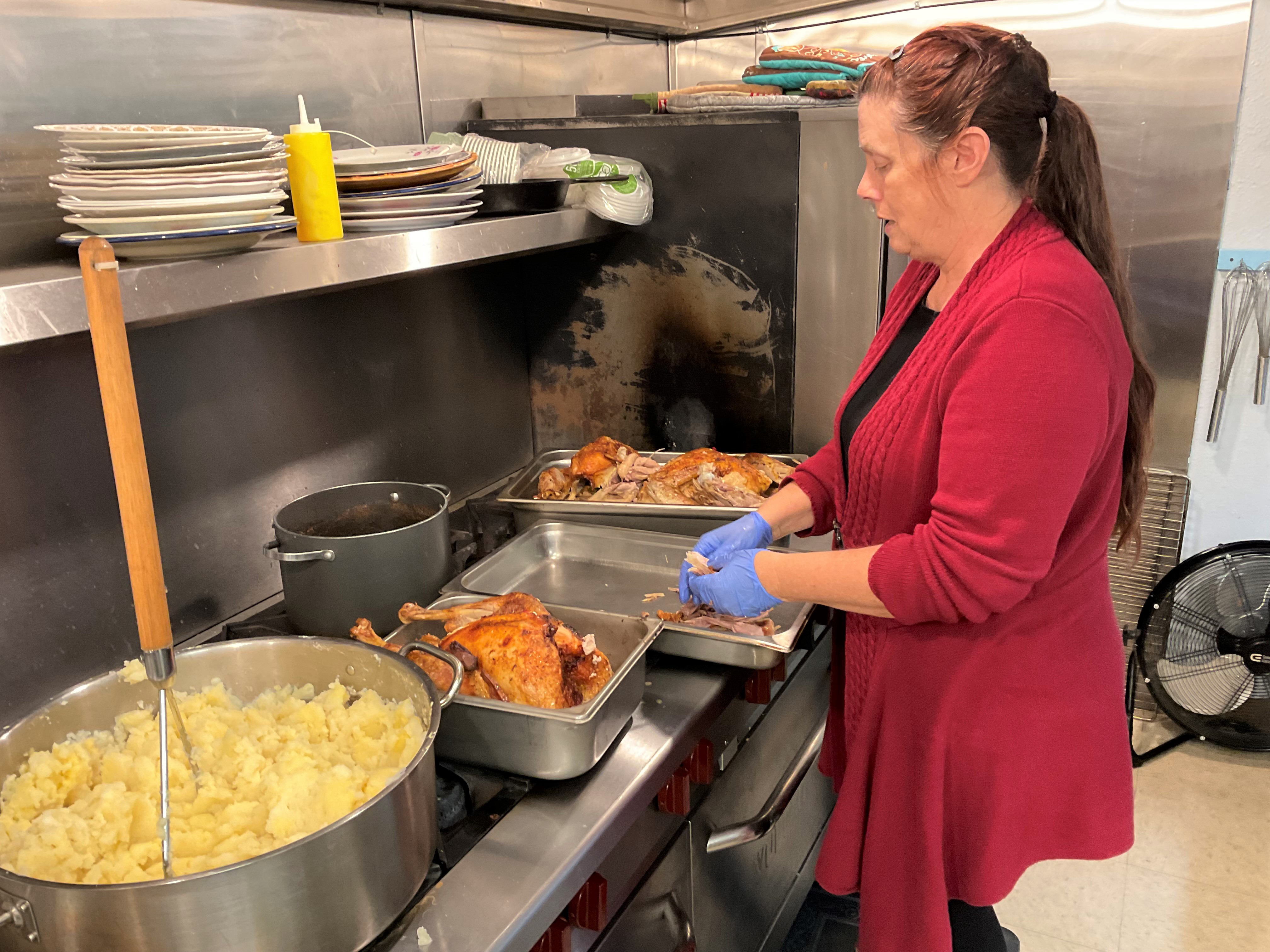 Standing at the stove mashing potatoes, the senior center’s past president said she is hoping to recruit kitchen volunteers to get the Senior Center café reopened to serve weekday lunches and Saturday breakfasts – plus kitchen volunteers for the warming center on an as-needed basis. The senior center prepares hot dinners and breakfasts and serves the meals to unhoused guests when the temporary overnight shelter is open on especially cold nights.