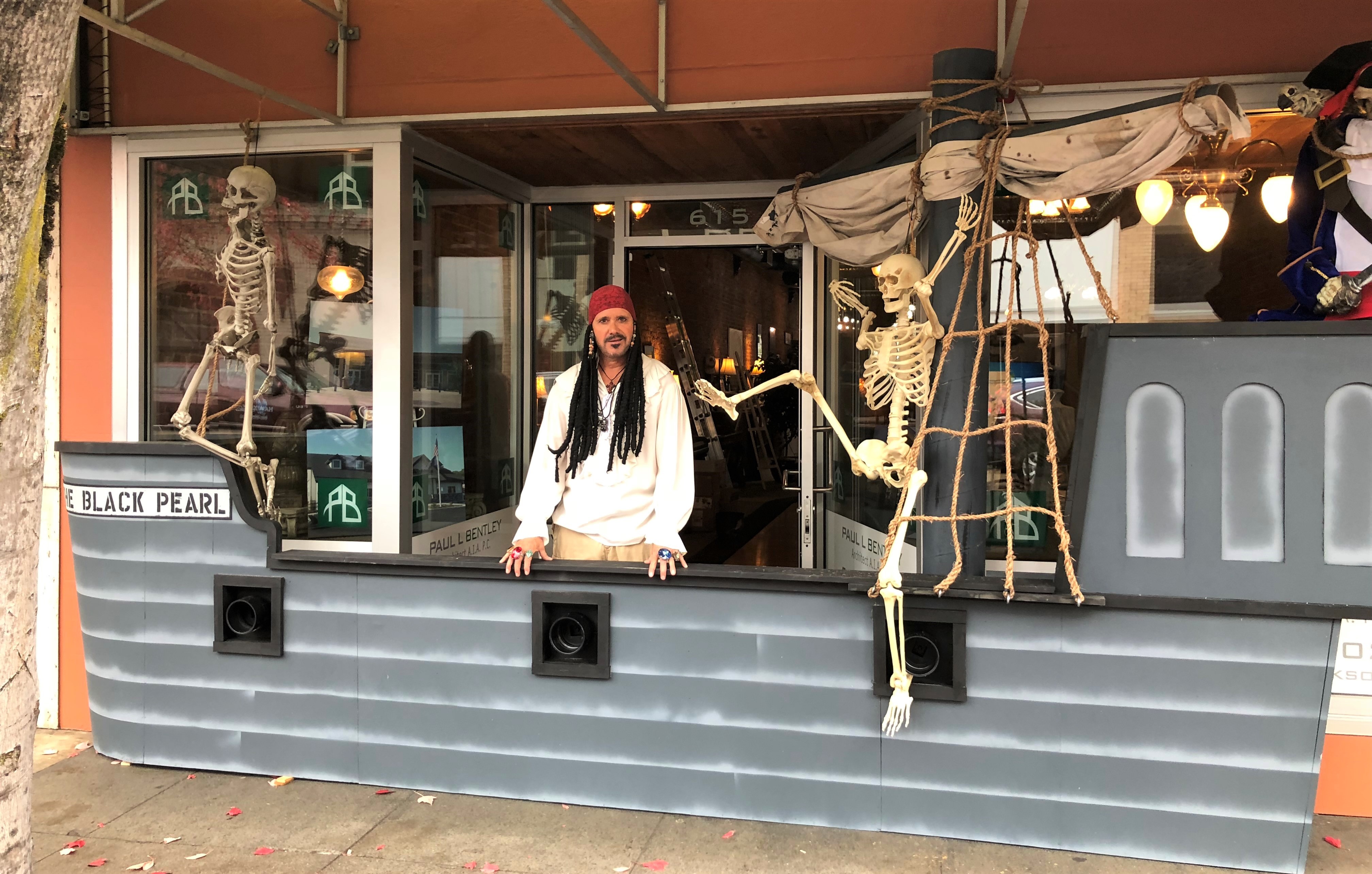 Architect Paul Bentley will turn into “Captain Jack Sparrow” from the “Pirates of the Caribbean” -- wearing a dreadlock wig, pirate garb, rings on each finger and a flintlock pistol. His “pirate wench” wife Terry and other friendly pirates will join him on the Black Pearl, a 20-foot wooden ship façade that will boast a plank this year.