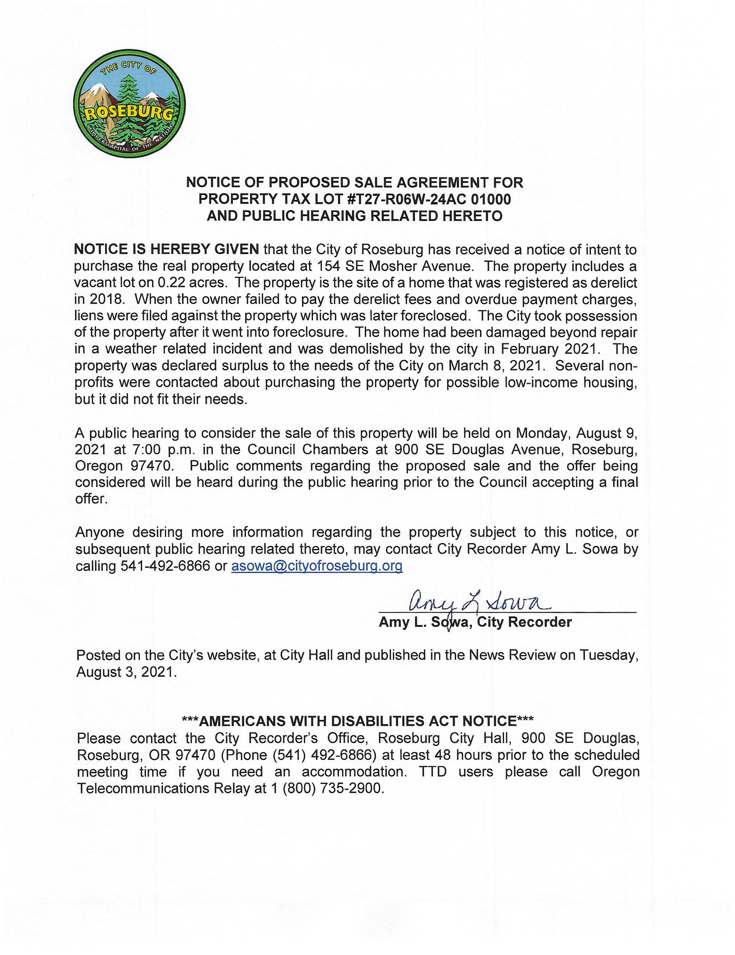 Notice of Proposed Sale Agreement and Public Hearing regarding 154 SE Mosher Avenue Aug 03, 2021RoseburgAdmin