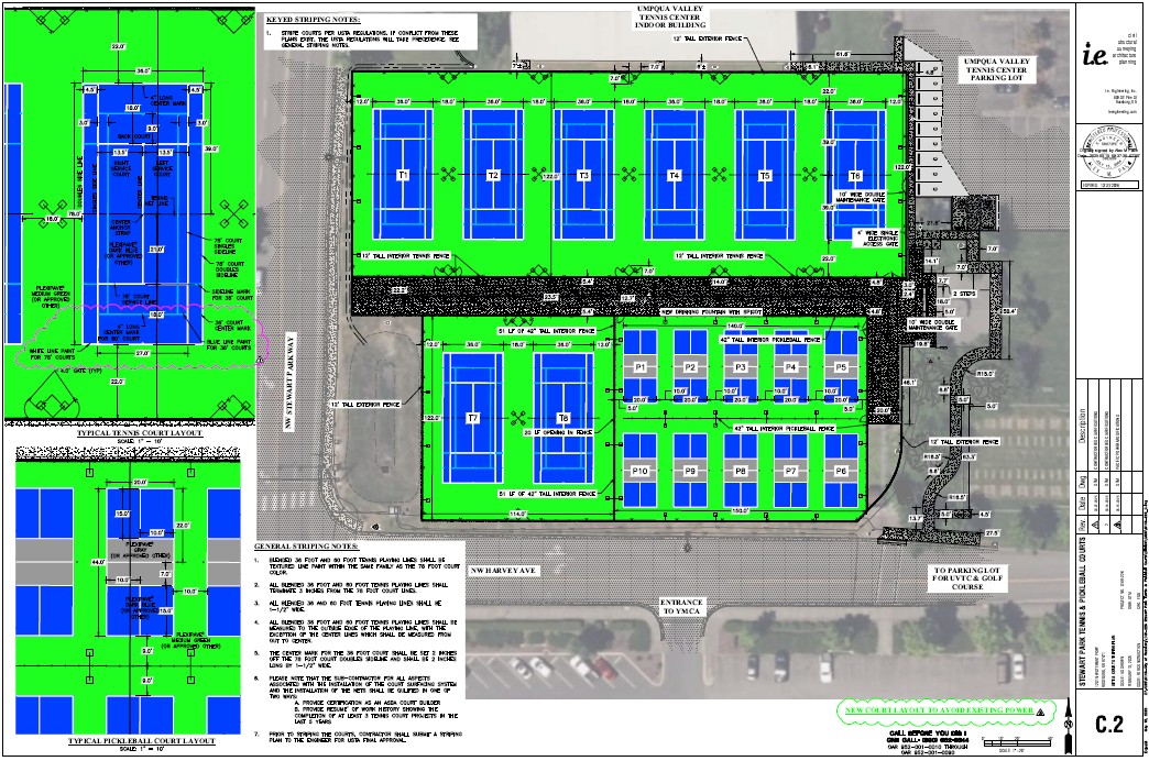 The project is being made possible thanks to a $750,000 state grant won by Roseburg Parks and Recreation Program Manager Velorie “Val” Ligon, $523,000 in City funds and $1.1 million in matching community funds raised by the nonprofit Umpqua Valley Tennis Center.