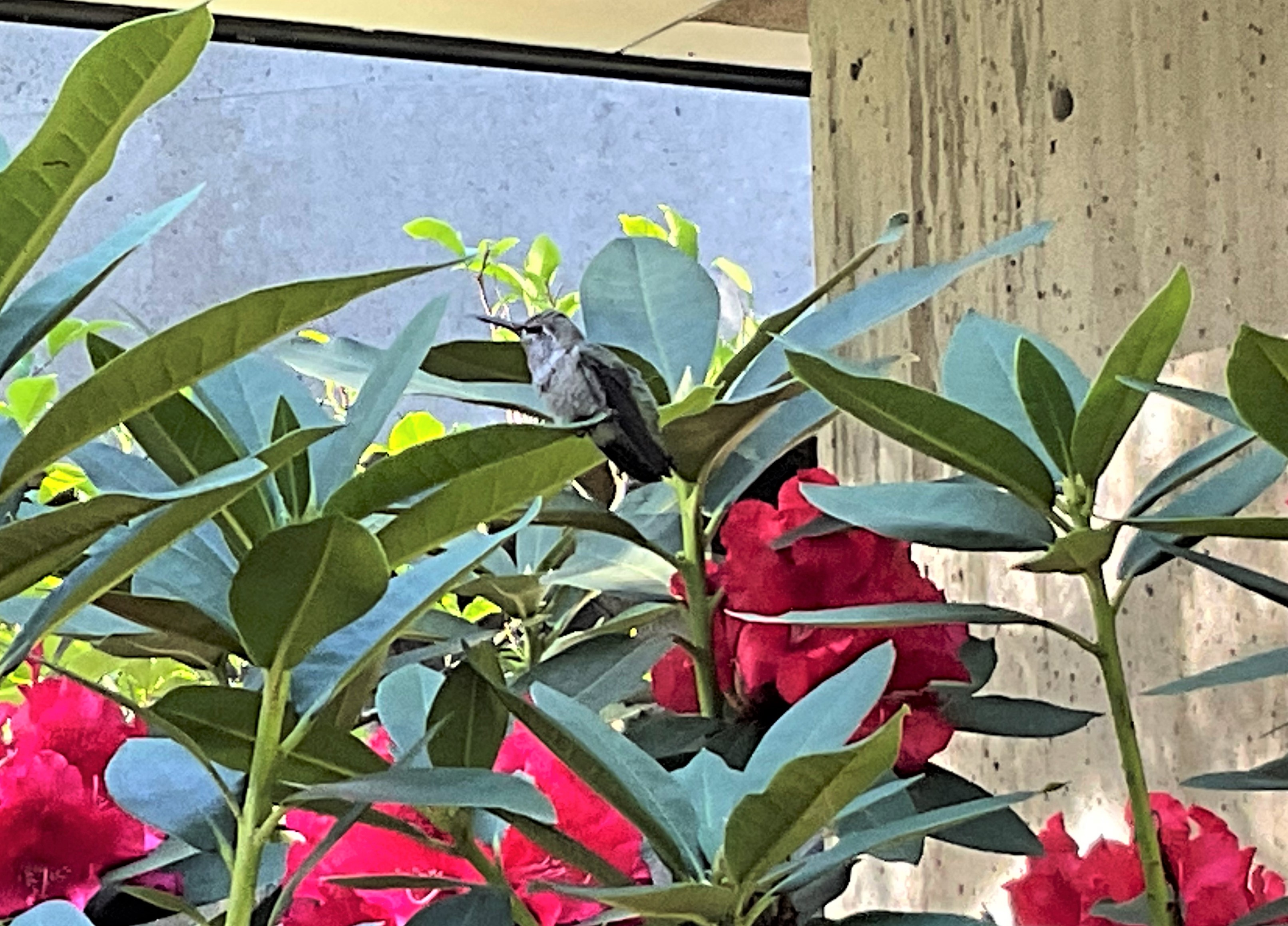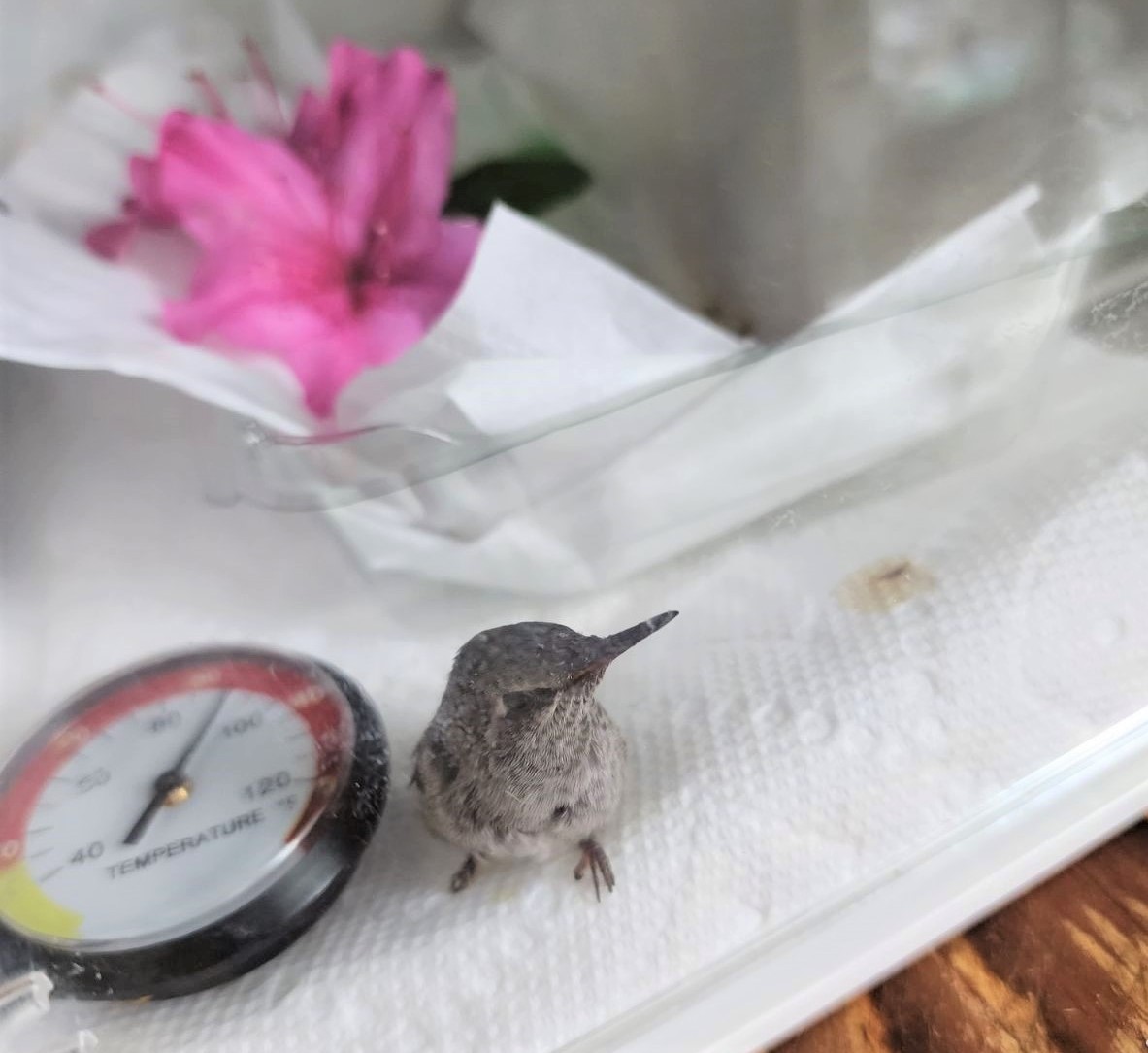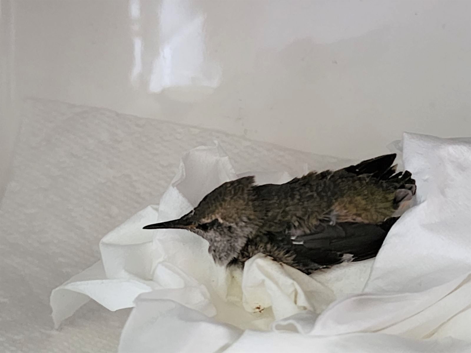 Shortly before the baby bird was first noticed on Tuesday, May 7, a City maintenance employee had come across the body of another hummingbird – most likely the mother – that was suspected to have flown into a glass door and died a few feet from where the youngster was found. When first spotted on the ground, the baby was alive, but not walking or trying to fly, and was in danger of being trampled.