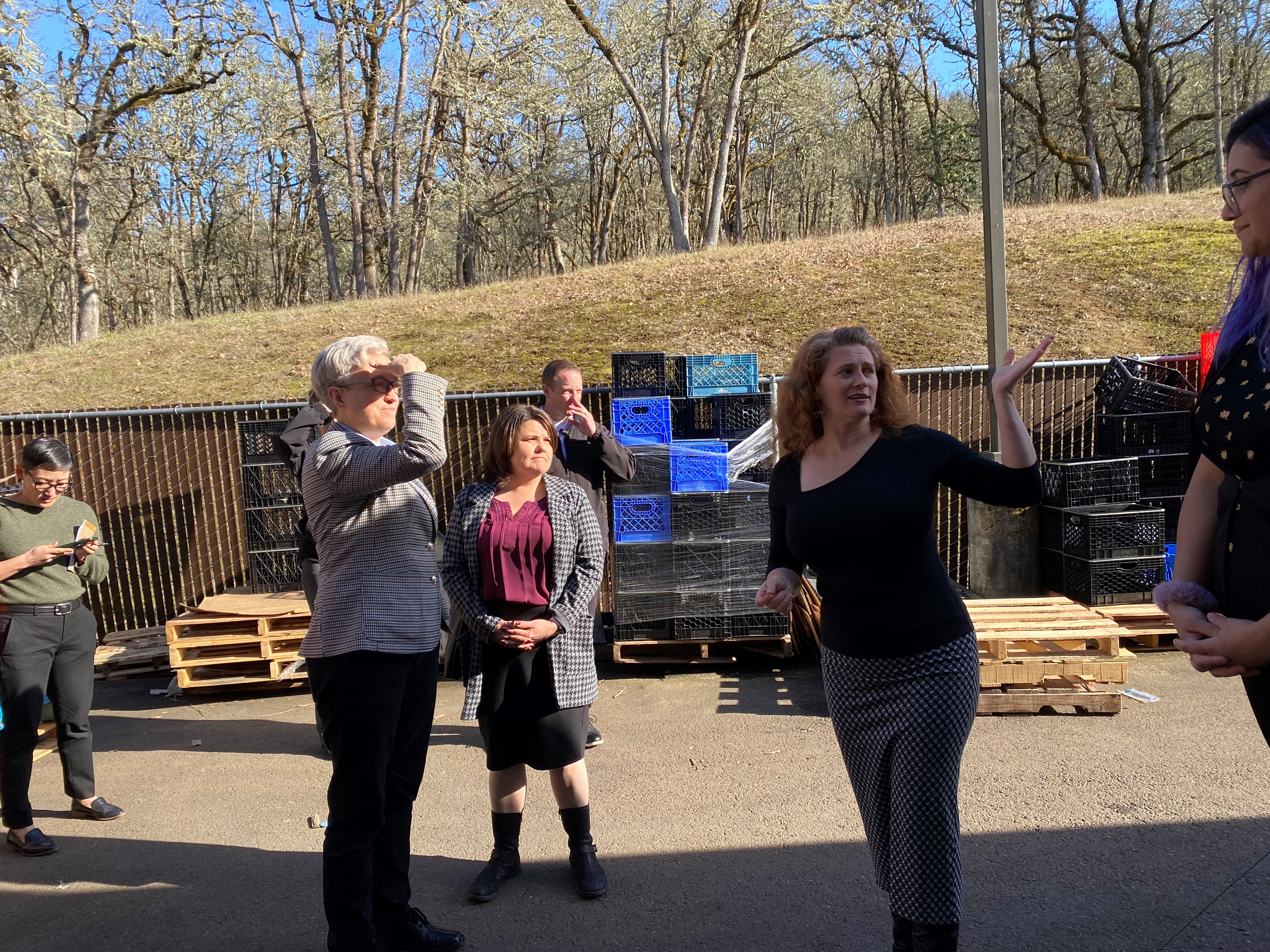 Gov. Tina Kotek and First Lady Aimee Kotek Wilson tour Feeding Umpqua with Manager Sarah McGregor.