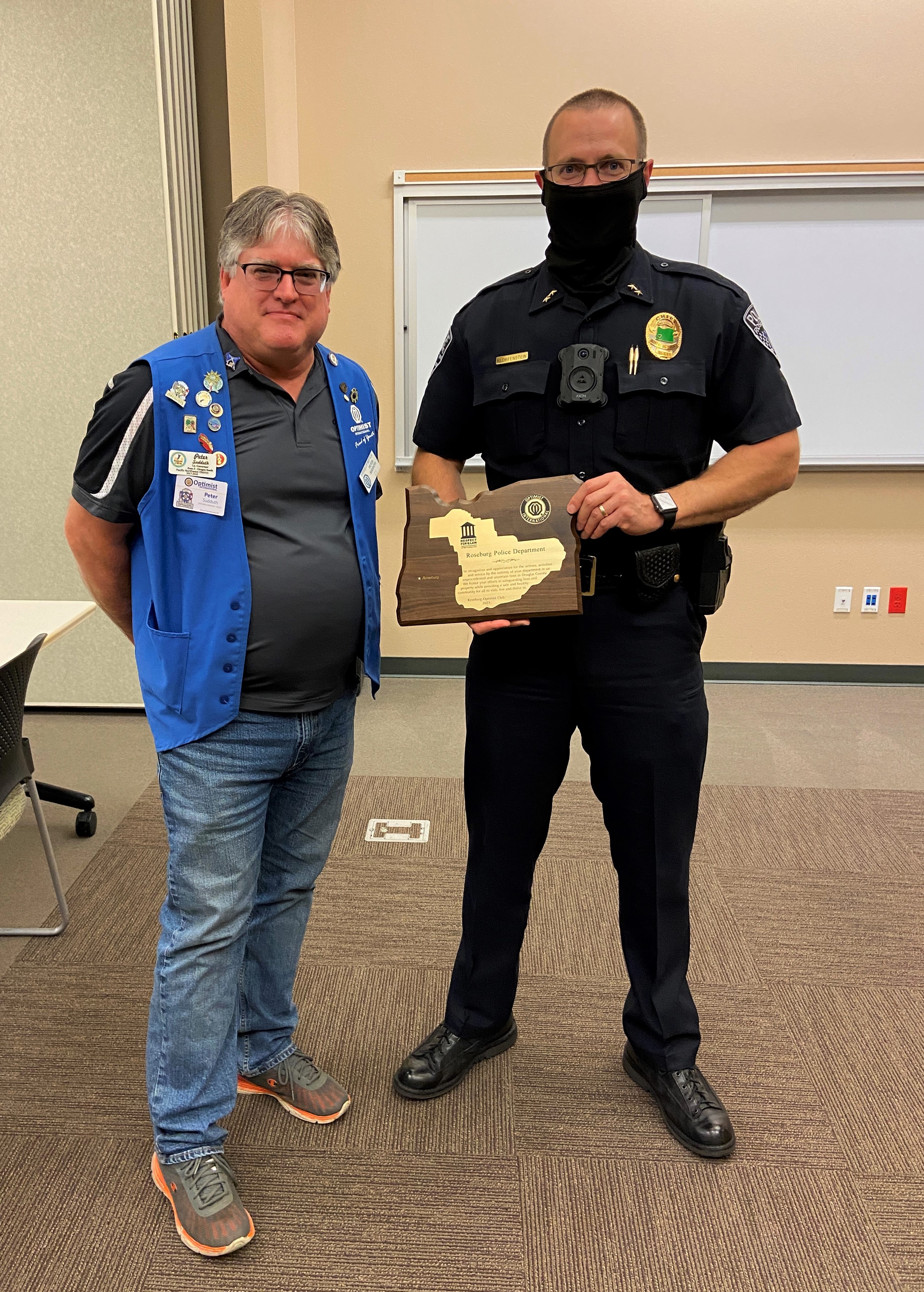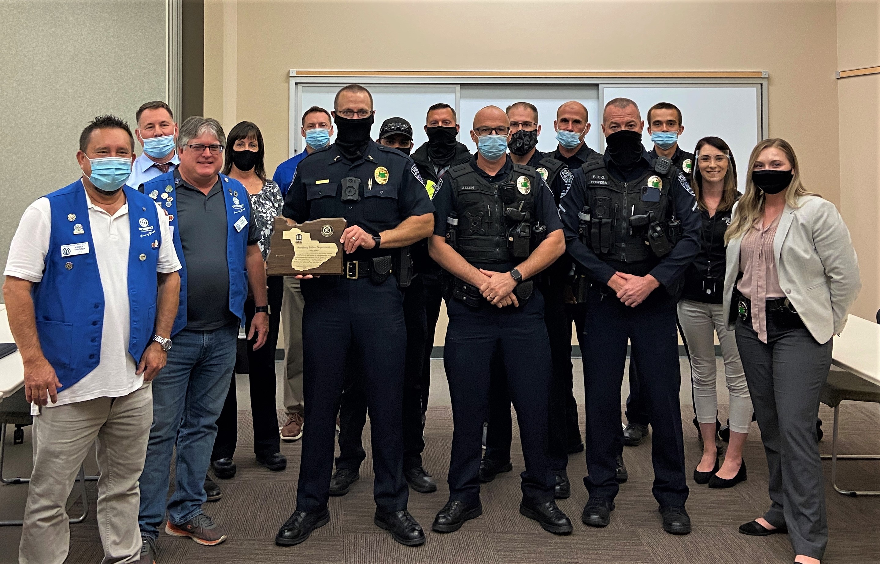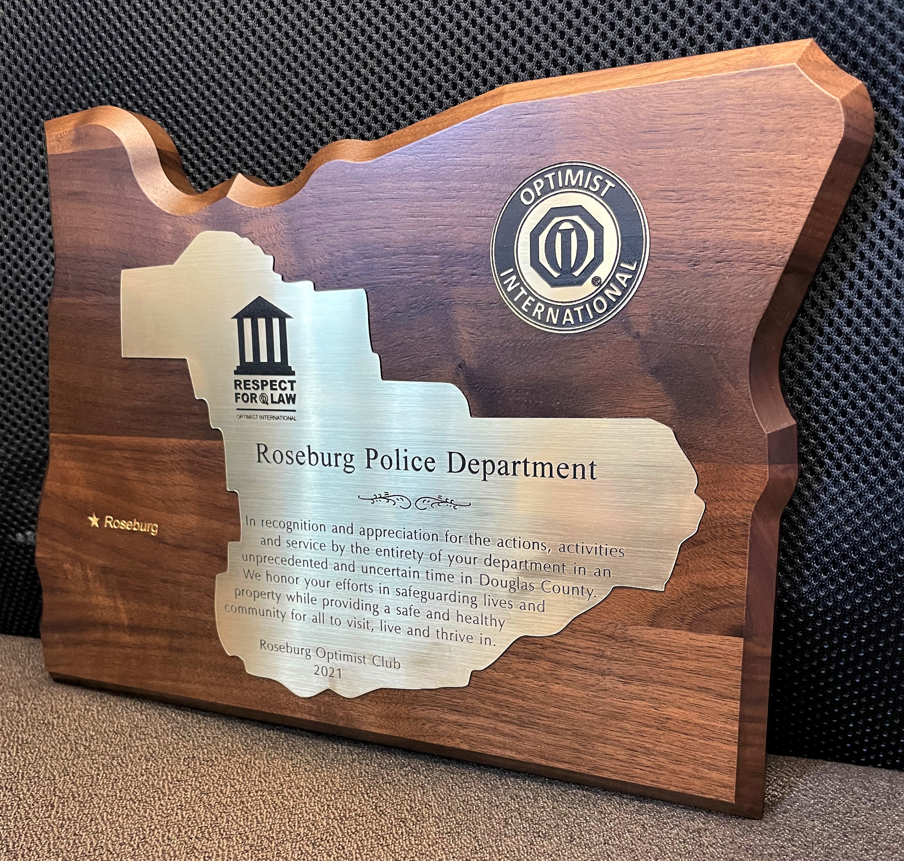 On Thursday, Oct. 14, 2021, Roseburg Optimist Club President Peter Sudduth visited the Roseburg Public Safety Center and presented a plaque to the Roseburg Police Department that reads: