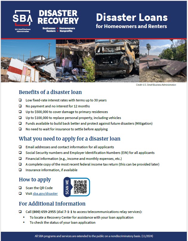 Interest rates are as low as 4% for small businesses, 3.625% for nonprofits, and 2.75% for homeowners and renters with terms up to 30 years. Interest does not begin to accrue, and payments are not due until 12 months from the date of the first loan disbursement. The SBA determines eligibility and sets loan amounts and terms based on each applicant’s financial condition.
