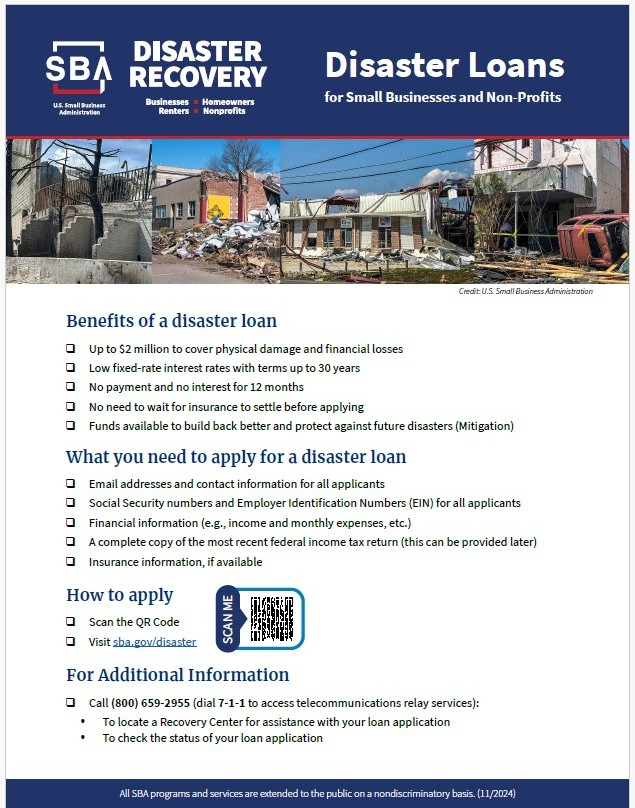 “When disasters strike, SBA’s Disaster Loan Outreach Centers perform an important role by assisting small businesses and their communities,” said Chris Stallings, associate administrator of the Office of Disaster Recovery and Resilience at the U.S. Small Business Administration. “At these centers, our SBA specialists help business owners and residents apply for disaster loans and learn about the full range of programs available to support their recovery.”