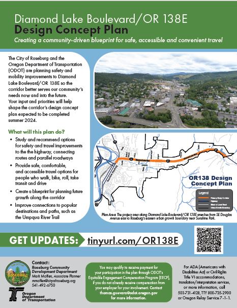 ROSEBURG, Ore. – The City of Roseburg and the Oregon Department of Transportation (ODOT) are pleased to announce the Diamond Lake Boulevard/OR 138E Design Concept Plan.