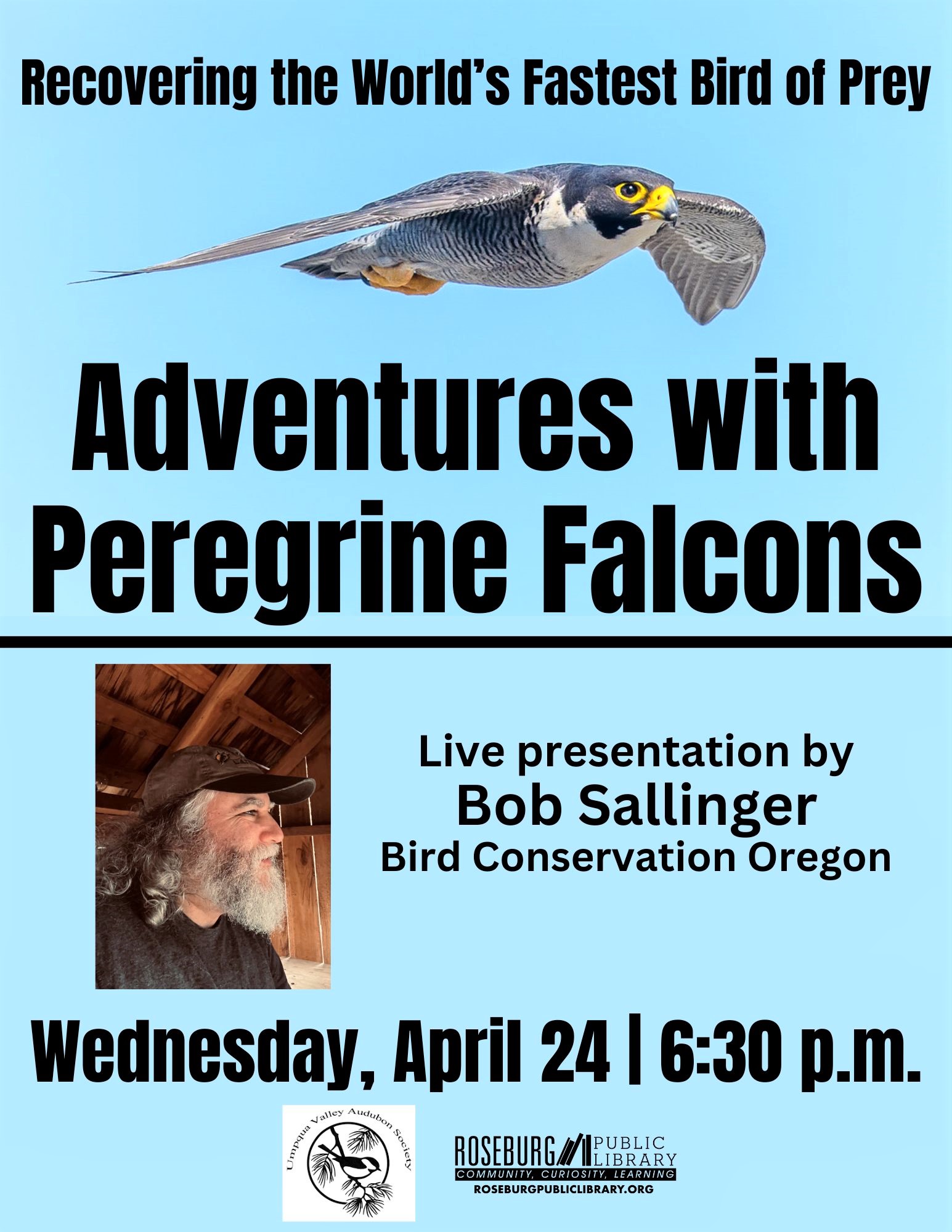 ROSEBURG, Ore. – The Umpqua Valley Audubon Society and Roseburg Public Library invite the public to “Recovering the World’s Fastest Bird of Prey: Adventures with Peregrine Falcons” presented by Bob Sallinger at 6:30 p.m. Wednesday, April 24.